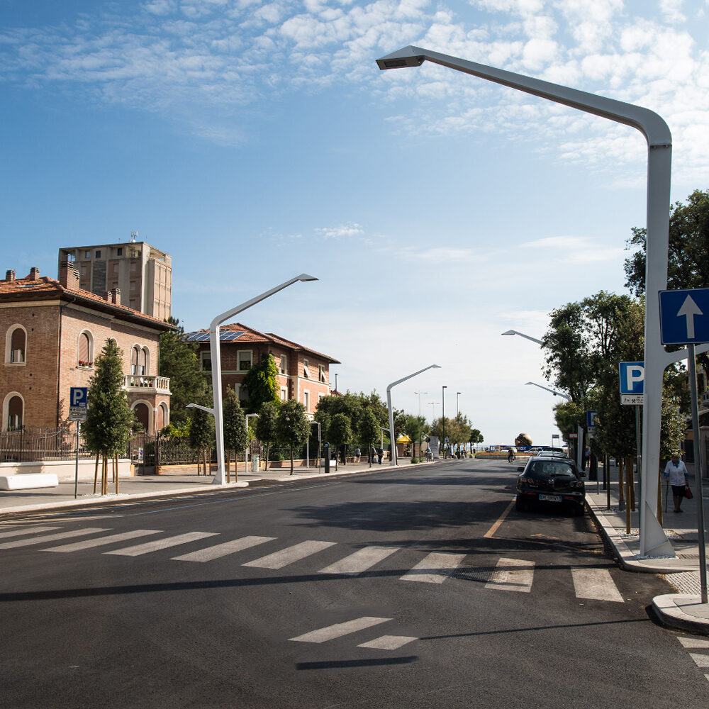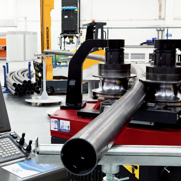 Une presse horizontale permet le processus de déformation du tube et des rétreints des différents troncs à des diamètres différents. Réaliser un mât rétreint à fort impact esthétique fait la différence dans les installations de type urbain.